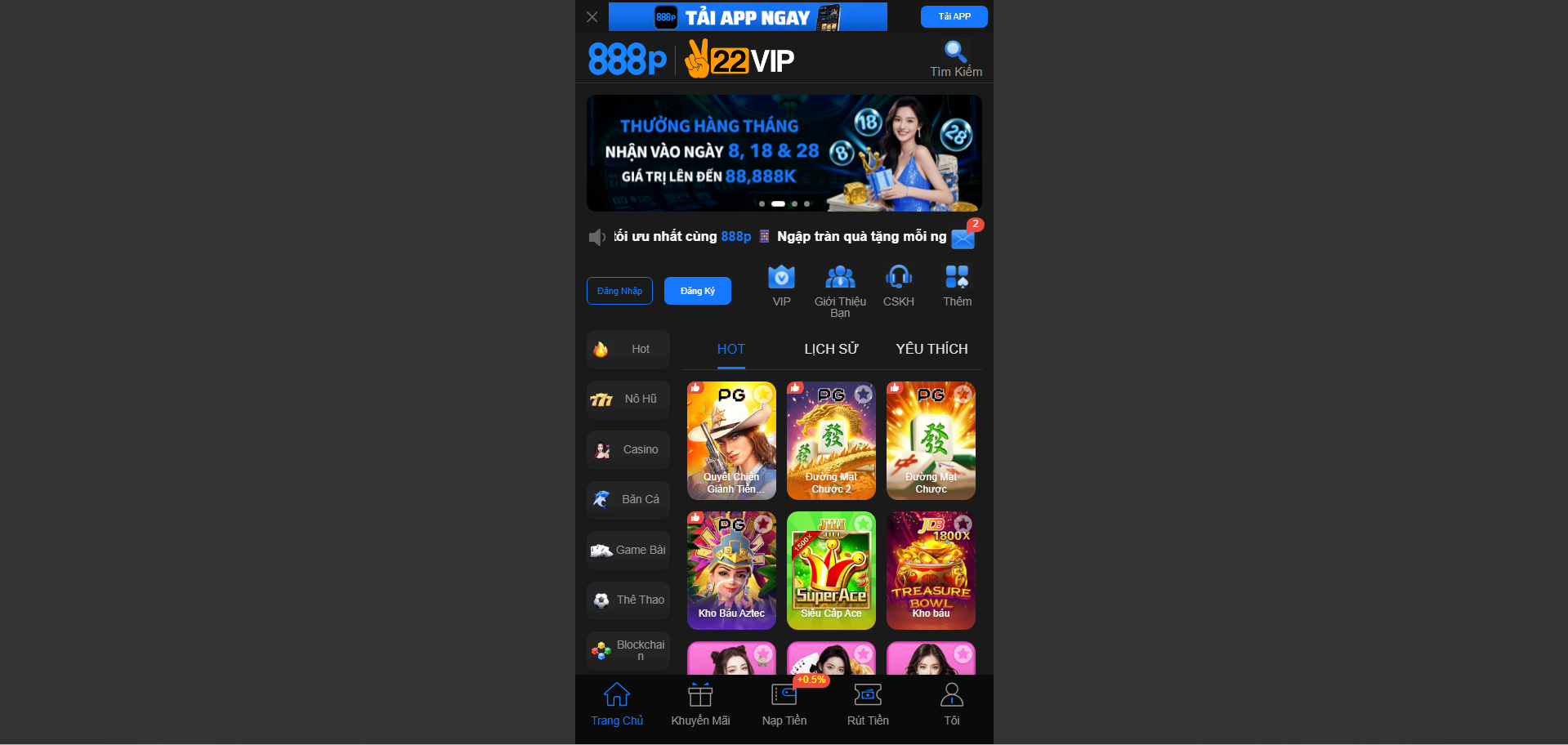 Chương trình khuyến mãi hàng ngày, hàng tuần và hàng tháng. Giá trị lên tới 88.888.888, nạp đầu tặng 100%, hoàn trả tới 3%.